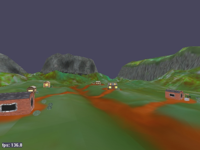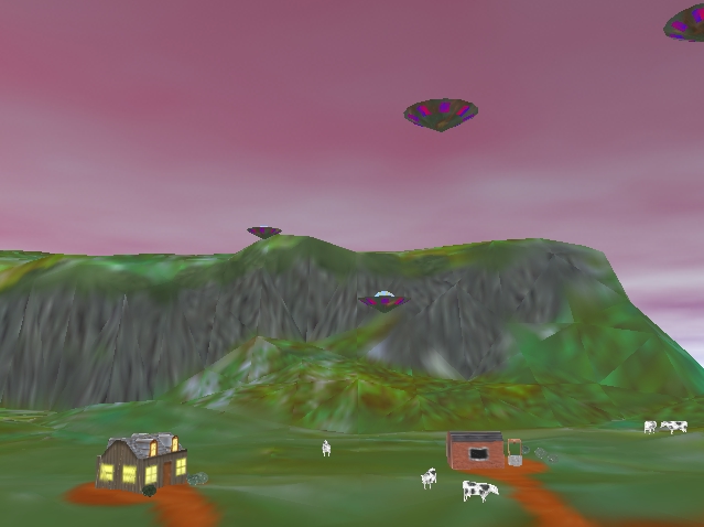 The complete scene runs at around 50 fps with 20436 triangles per frame (depending on the number of cows, UFOs, and fireballs).