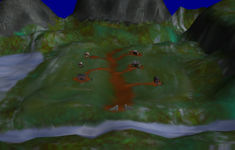 Terrain created in Bryce and painted with Nichimen Nendo. Houses, bushes, and gate were all modeled and painted in Nendo as well.